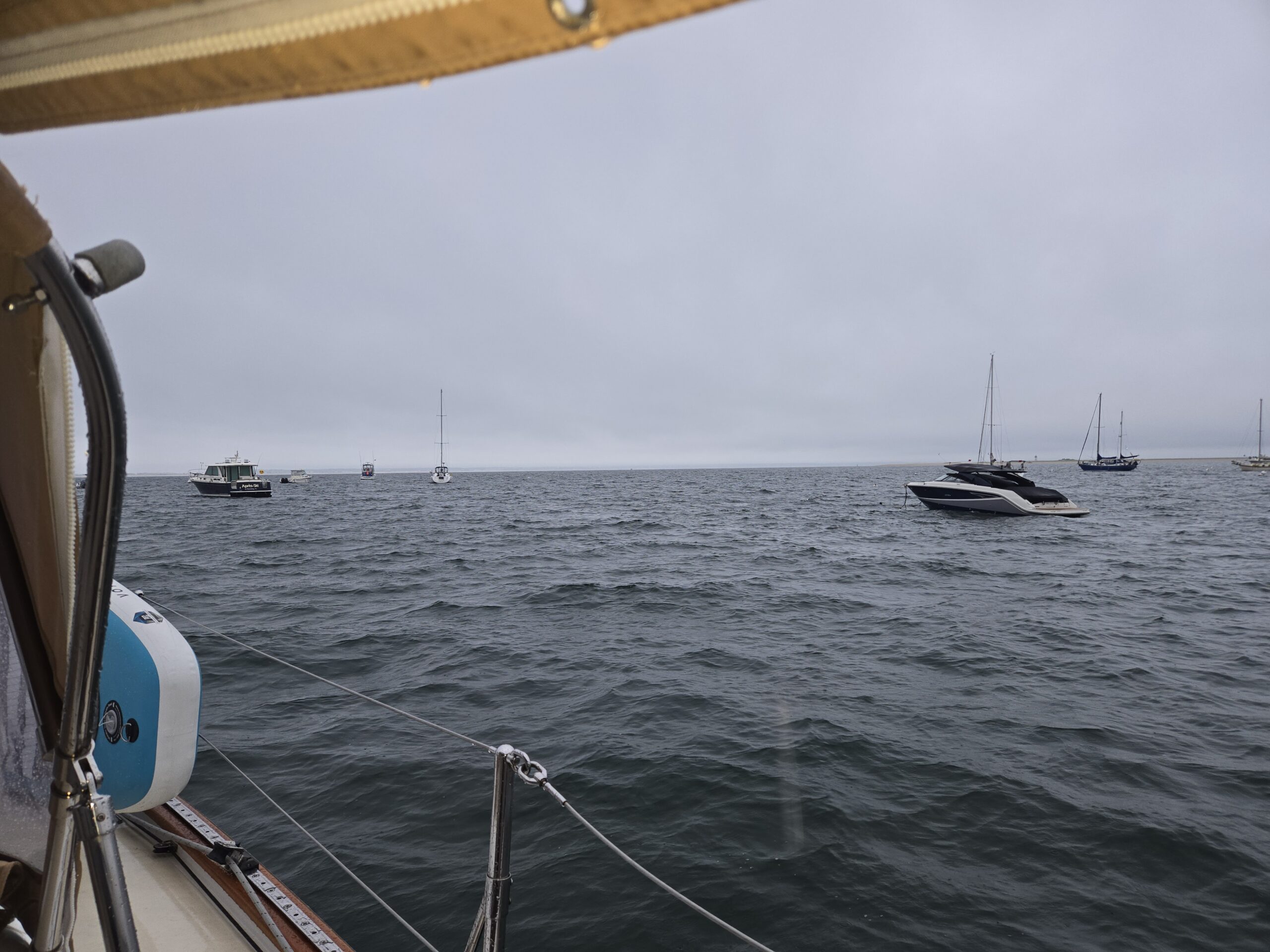 After a couple of very windy nights on a mooring in a mostly empty mooring field, it was finally time to leave ptown. The system that caused all those high winds left some rainy and slightly confused weather in its wake. The result of which is that there may be a nice stretch of days with wind NOT out of the typical southwest. We decided not to squander that and make some progress back toward the Canal and Buzzards Bay. The only downside is that it was forecast to be pouring rain for this leg.