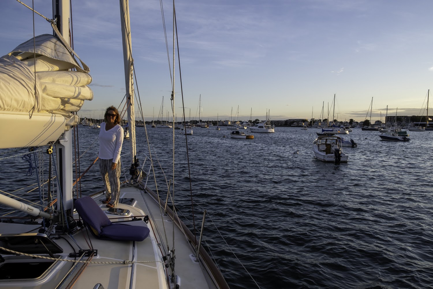 The North Kingstown (wickford) moorings are the best deal in New England. Free to grab for a day stop and only $35 (in 2025) for an overnight. Wakes in this harbor are not a problem – the power boaters are very compliant with speed here. We had a lovely dinner and sunset for the last night aboard.
